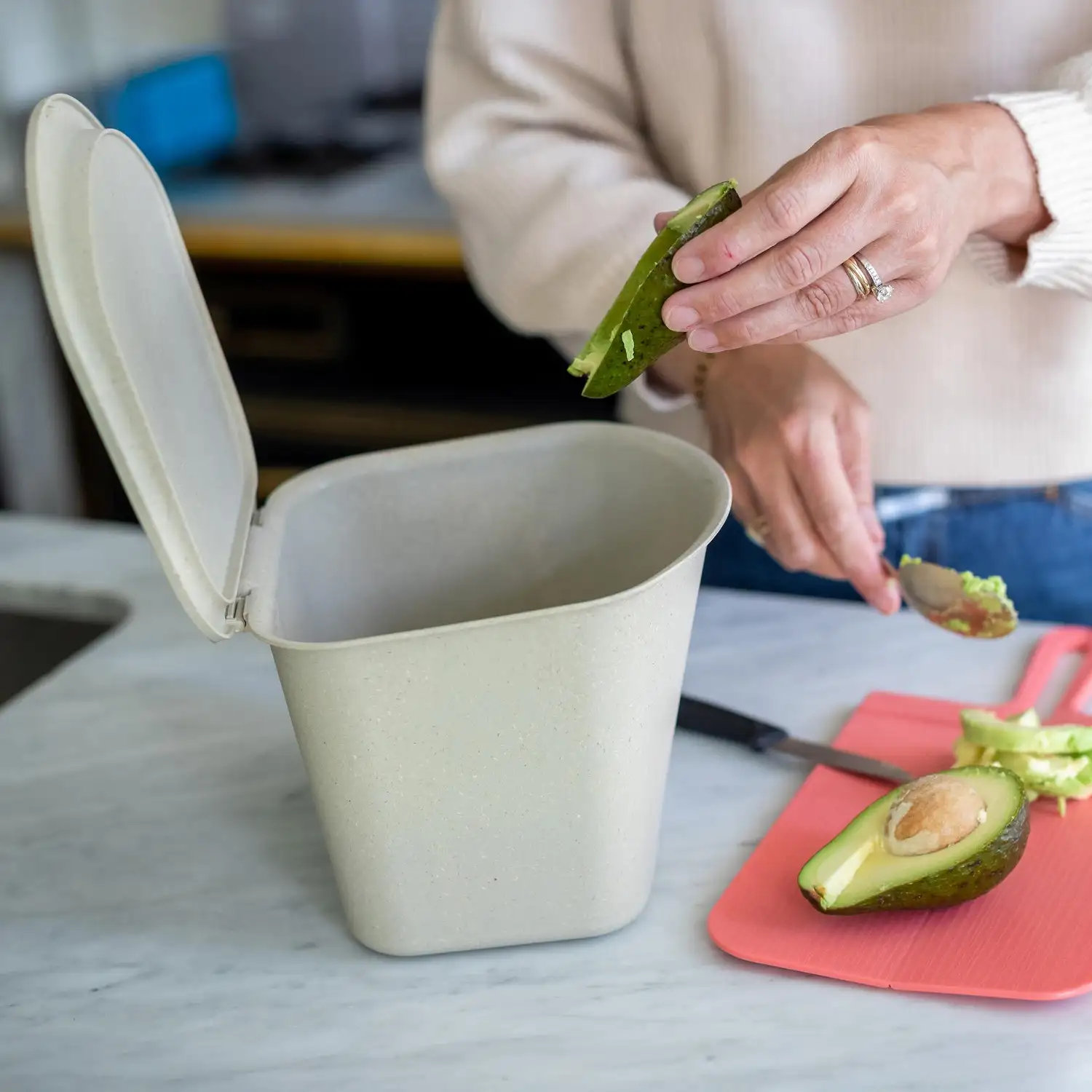 Der Bio Abfall Behälter von Koziol sieht schick aus, bietet reichlich Platz für Küchenabfälle und lässt sich mit seinem Deckel hygienisch verschliessen.